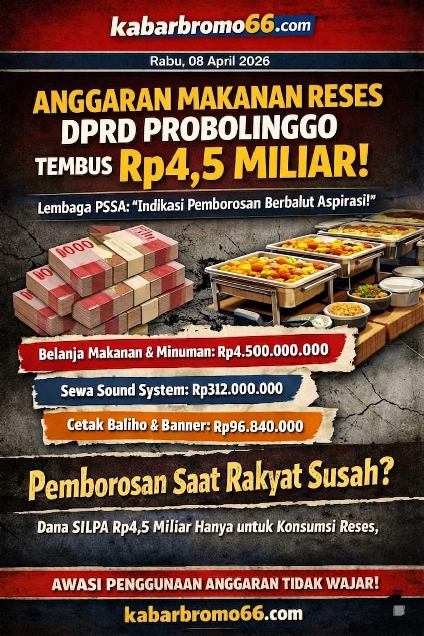 PROBOLINGGO, kabarbromo66.com – Sorotan tajam tertuju pada Sekretariat DPRD Kabupaten Probolinggo terkait alokasi anggaran dalam Rencana Pengadaan tahun 2026. Dari total pagu pengadaan, anggaran untuk sektor “perut” dalam kegiatan reses dinilai tidak rasional dan melukai rasa keadilan masyarakat.