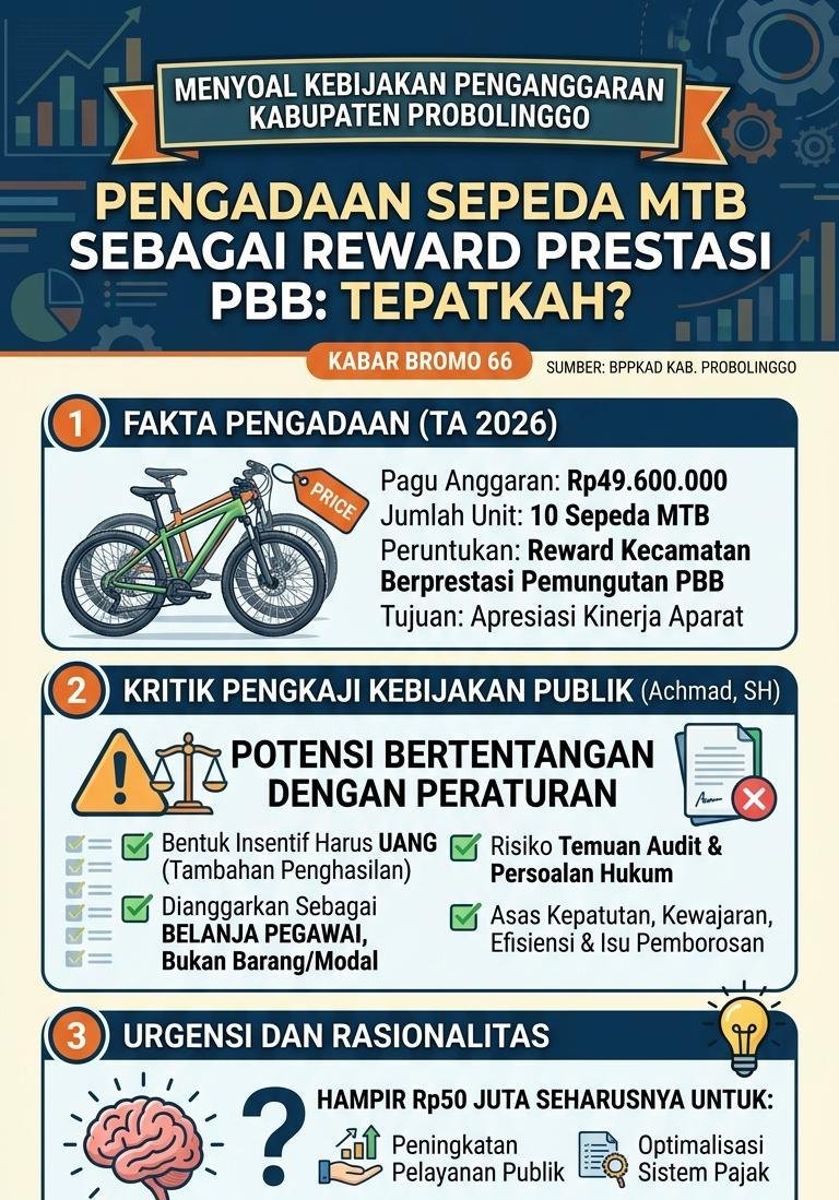 PROBOLINGGO, kabarbromo66.com – Kebijakan penganggaran di lingkungan Kabupaten Probolinggo kembali menjadi sorotan. Kali ini, Badan Pengelolaan Pendapatan, Keuangan, dan Aset Daerah (BPPKAD) setempat diketahui mengalokasikan anggaran untuk pengadaan reward berupa sepeda gunung (MTB) sebanyak 10 unit dalam Tahun Anggaran 2026 dengan total pagu mencapai Rp49.600.000.