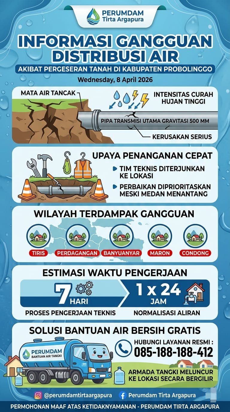 Adapun wilayah yang mengalami gangguan distribusi air bersih meliputi Unit Pelayanan Tiris, Perdagangan, Banyuanyar, Maron, hingga Unit Pelayanan Condong. Pihak manajemen memperkirakan proses pengerjaan teknis akan memakan waktu selama 7 hari, dengan tambahan waktu normalisasi aliran sekitar 1 x 24 jam setelah perbaikan fisik selesai agar tekanan air kembali stabil sampai ke rumah pelanggan.