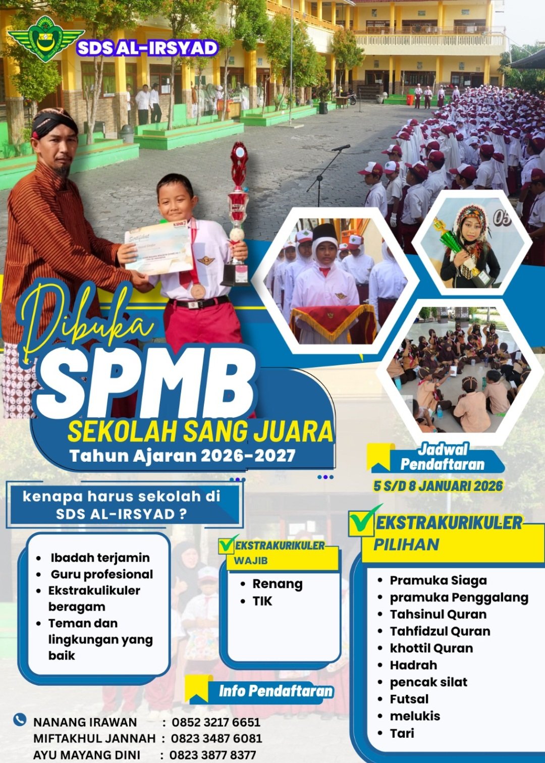 Pendaftaran dibuka mulai 5 hingga 8 Januari 2026. Orang tua atau wali murid yang ingin mendapatkan informasi lebih lanjut dapat menghubungi panitia penerimaan melalui nomor kontak yang tercantum dalam pengumuman resmi.